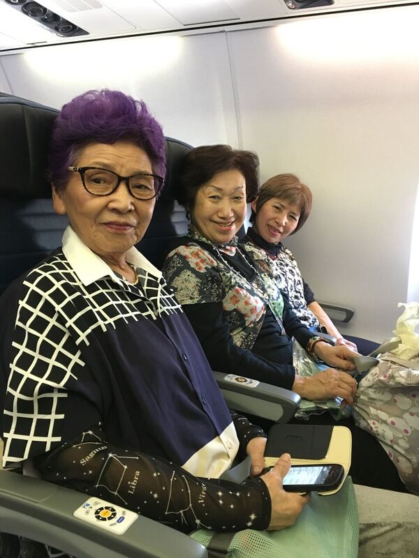 飛行機の中もお話しが弾みます